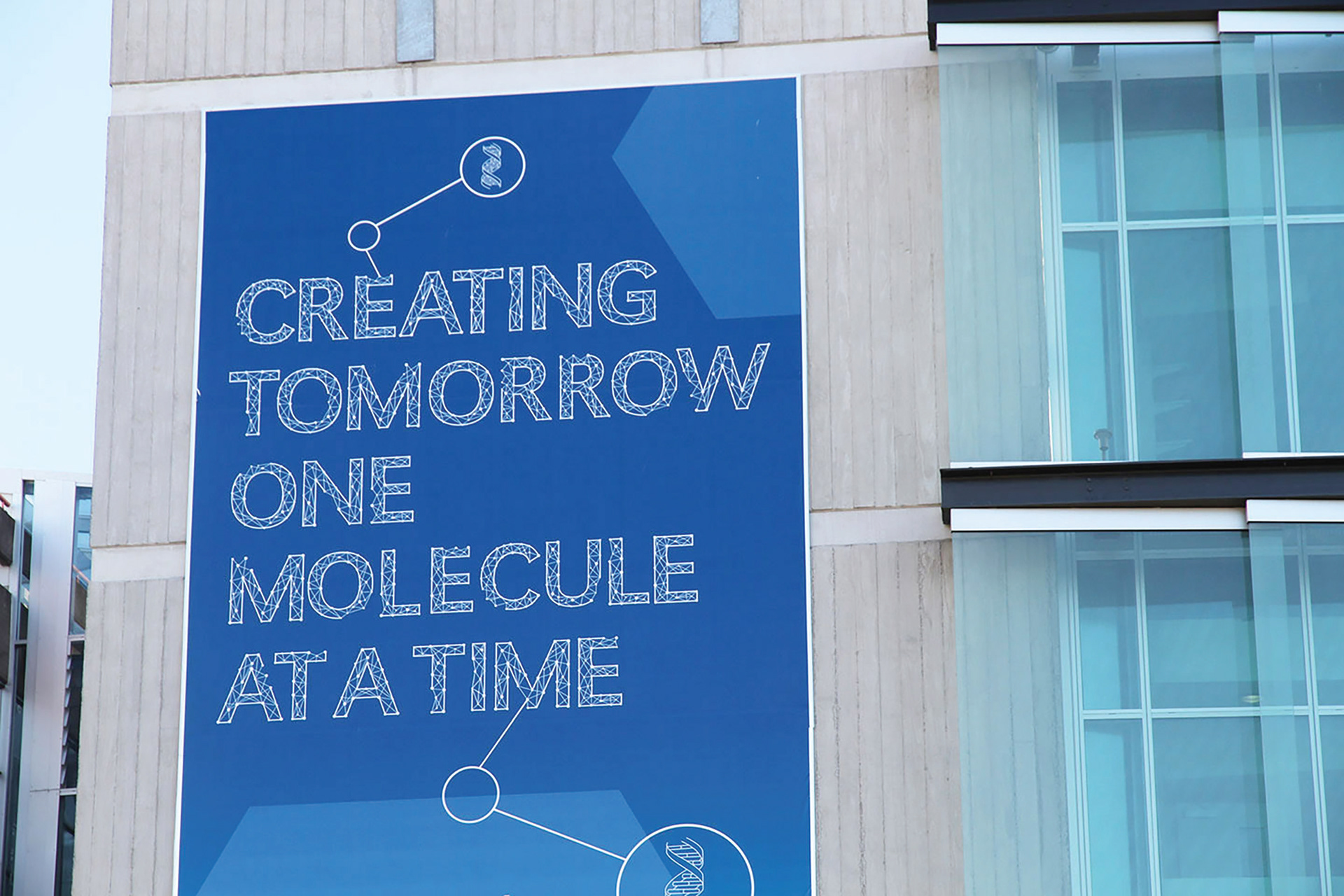 Design a 10 metre billboard that is visually appealing to secondary school students and pedestrians with a science theme as the main subject. Creating a typeface to look like molecules coming together to form the main heading.